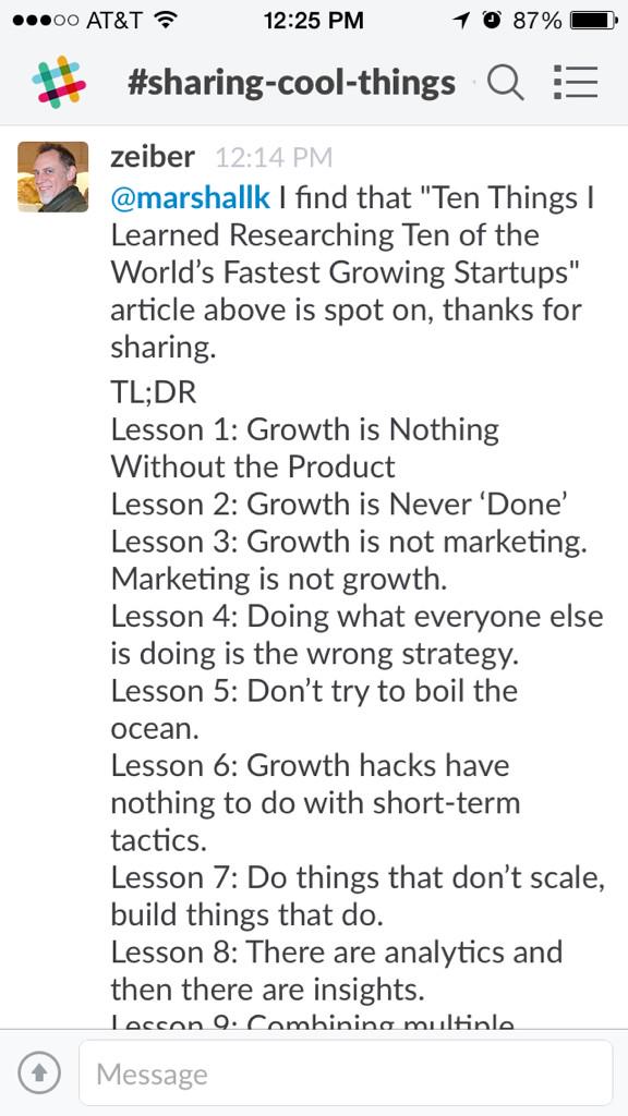 @marshallk tweeted: Ten things @morganb learned from 10 fast growing startups, summarized by @icontra in @SlackHQ