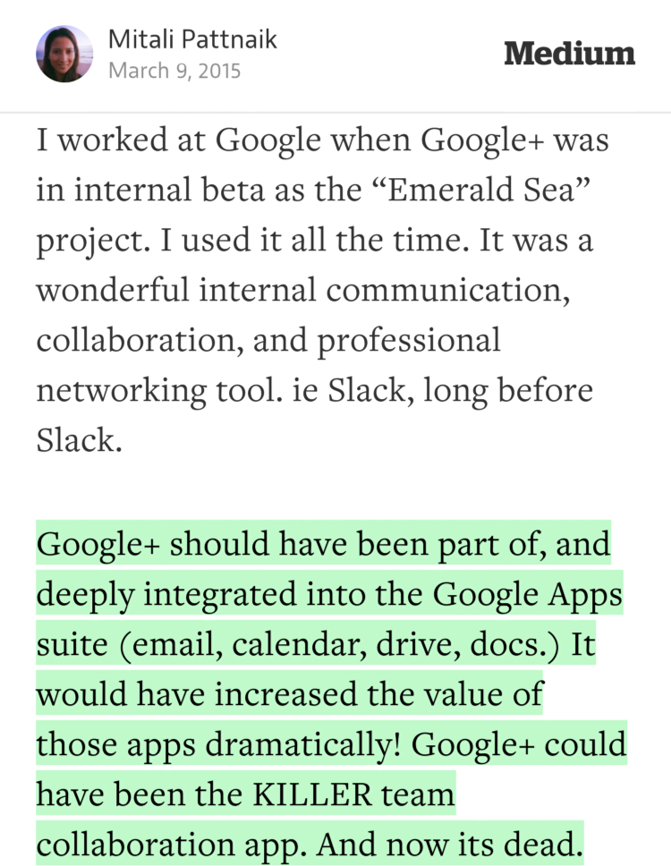 "Google+ should have been part of, and deeply integrated into the Google Apps…" —